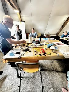 Workshops have taken place in the 1000 year old castle in two spacious studios and participants have plenty of room to spread out and work. The facility is amazing with 1 large etching press, places to work, and a large outdoor yard