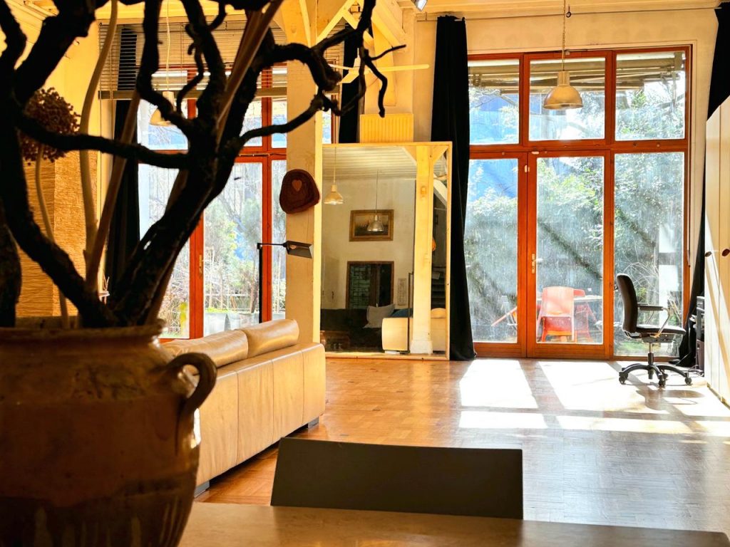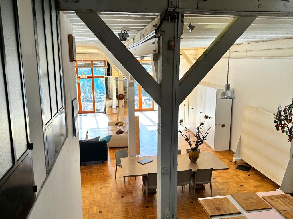 The space is a large studio-loft (157 m² / approx. 1,690 sq ft) with 4-metre ceilings, located within an established artist and creative community. It forms part of a group of working artist lofts, with access to a shared garden, and is approximately 10 minutes from central Paris by public transport.