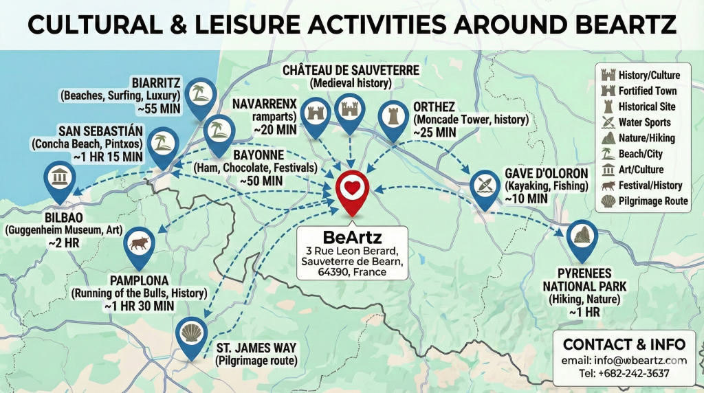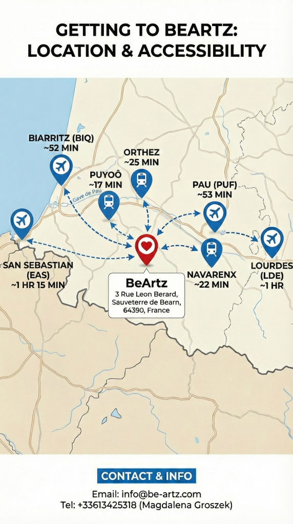 By Train The nearest train stations are Puyoô (10 mins away) and Orthez (20 mins away). Both are well-connected to major French cities. From the station, you can take a local taxi or the regional bus (Line 523) to Sauveterre-de-Béarn (Stop: Place Royale).