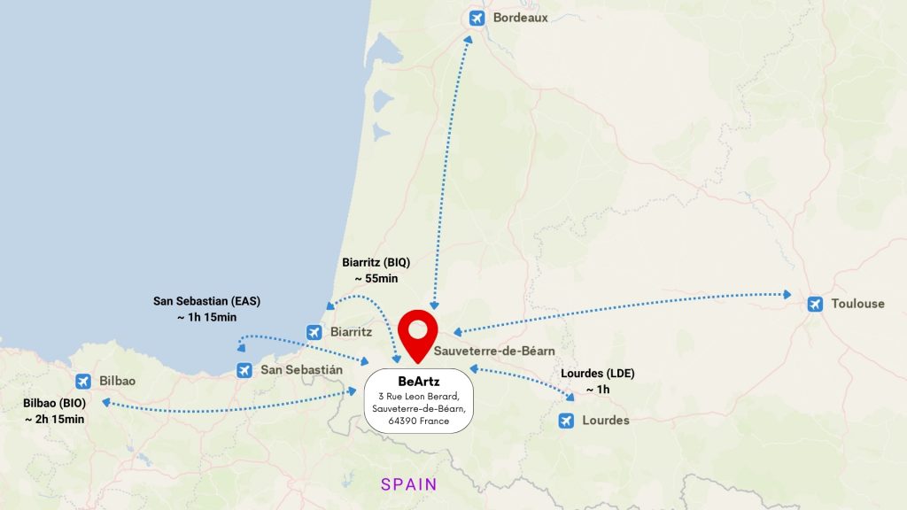 - Biarritz Airport (BIQ): The closest international airport, approximately 55 minutes away by car.